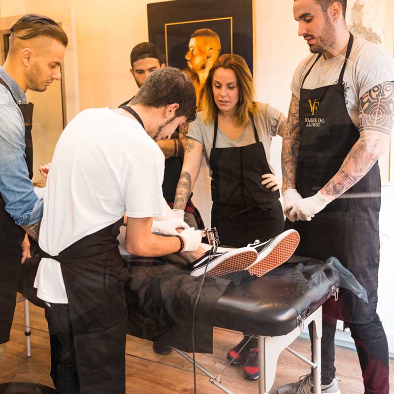 Nuestra Escuela de tatuadores es un espacio creativo en Madrid donde se funden presentes y futuros tatuadores en un ambiente cálido y vanguardista. Nuestras instalaciones, conformadas por la Escuela y por el Estudio, sumergen a los alumnos en un ambiente lectivo y de trabajo real, compartiendo sus experiencias con tatuadores de referencia en el panorama nacional.